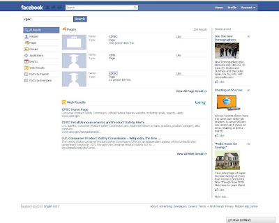 First, we logged into our Facebook account and input “CPSC” into the search field. Apparently, there is not one, but five unofficial Facebook pages with the titles referencing the agency. (The search results for “CPSC” are depicted above.). Note that collectively, the three unofficial Facebook pages in that initial search result have a total of twelve followers or admirers or likers or whatever they’re called on Facebook. Note also that the “Web Results,” depicted at the bottom of the page, return two links to the official CPSC site and a third to the agency’s Wikipedia entry (which, as far as we know, the CPSC has not yet warned us against).
