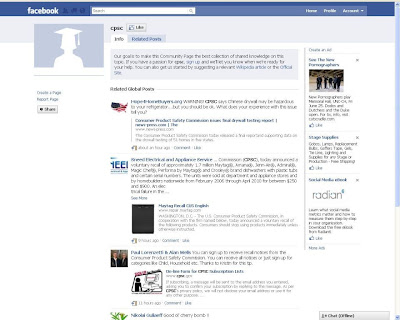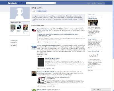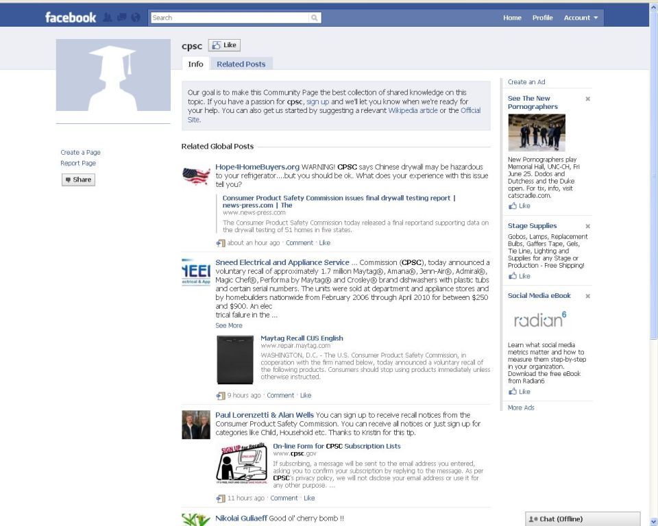 The first Facebook Community Page (depicted above) boasts eleven followers. It appears to be some type of automated page which collects various Facebook status updates and posts which reference the search term “CPSC.” Facebook users who update their status or posts links including the acronym for the agency will find their posts collected on this community page.