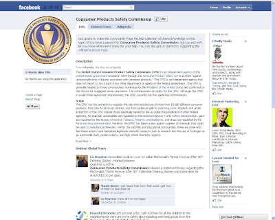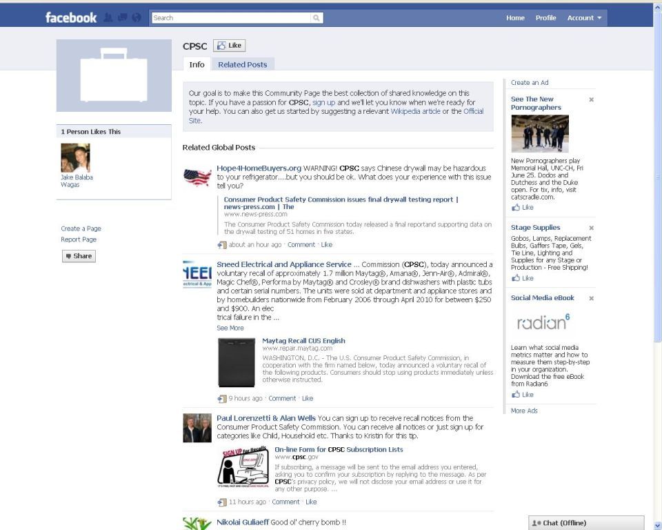The first Facebook Community Page (depicted above) boasts eleven followers. It appears to be some type of automated page which collects various Facebook status updates and posts which reference the search term “CPSC.”  Facebook users who update their status or posts links including the acronym for the agency will find their posts collected on this community page.