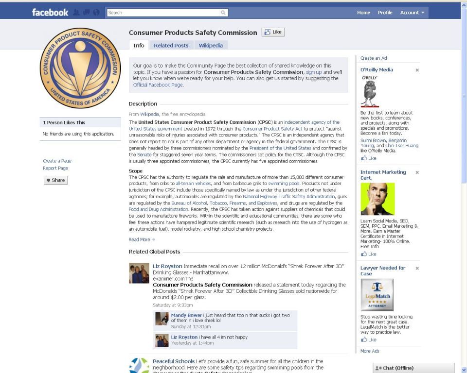We also input the full name of the CPSC into Facebook’s search field and found the page depicted above, complete with a more official looking profile picture in the form of a seal.  The content seems to be primarily derived from Wikipedia’s CPSC entry, though, and only one person “likes” this unofficial incarnation of the CPSC on Facebook.