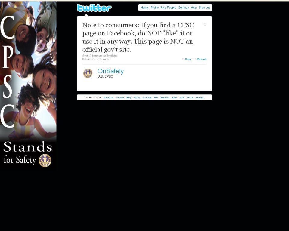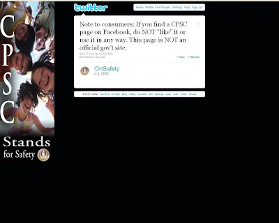 Strange things are afoot with respect to the Internet presence of the Consumer Product Safety Commission (“CPSC“). Earlier this week, the government agency issued a formal tweet warning users not to “like” or “use” in “any way” any unofficial Facebook pages dedicated to or representing themselves as the CPSC. (See above for a screen capture of the tweet in question.). Curiously, the tweet reads like a formal directive forbidding any participation in Facebook’s unofficial CPSC fora. (Yes, we said “fora,” not forums. Get over it.). This stern pronouncement prompted some investigation on the part of our investigative reporters here at Abnormal Use, a site often covering the CPSC.