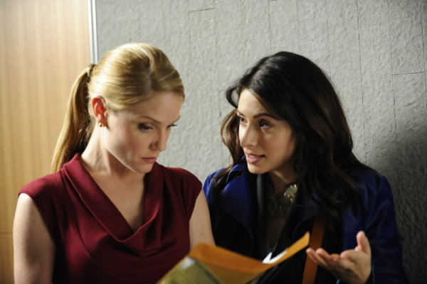 SARDO: Yes, very much so. You see it in one scene in the pilot in what Lauren faces. . . . [Y]ou see how she has to deal with a very important client of the firm and make a decision as to which way she’s going to take that. Kate will deal with some of those issues, also, because, it’s funny, when you have a lead as attractive as Sarah Shahi, and you want to portray her as very serious about her work, but at the same time, you can’t be oblivious to the fact that she’s gorgeous. So, we made a conscious decision to have characters react to that and react to her as a beautiful woman because she is one. If she was a handsome man, people would react in a certain way, so she will have people react to how she looks. . . . Lauren particularly will have to confront those things in her position because of her visibility as managing partner and the fact that she often has to play hardball within the firm and with other people who are interested in the firm.