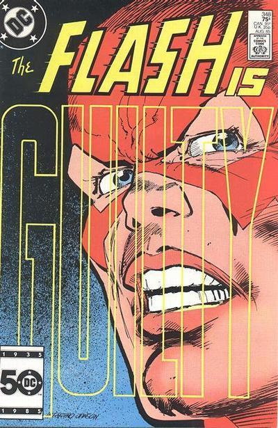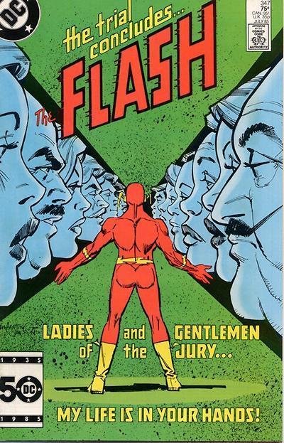 • Back in the 1980s, The Flash was put on trial for the murder of Professor Zoom, a villain also known as the Reverse Flash. Above, you’ll see the cover of The Flash #347, published back in 1985, which features the faces of the twelve members of the jury called upon to weigh the evidence against the hero. (We wonder how that voir dire was conducted.). Below, at the end of this post, you’ll find the cover of The Flash #348, which features the verdict rendered by that jury. Let’s just say it did not go well for The Flash.