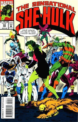 - Believe it or not, but the Marvel Comics character She-Hulk is an attorney. Above, you’ll see the cover of The Sensational She-Hulk #59, published not so long ago in 1994, during which She-Hulk, clad in her courtroom attire, asks the court for a “short recess” so that she can dispose of the host of super villains who have appeared. (One wonders how they all bypassed the security at the courthouse entrance). Whatever the case, we suspect the request was granted by the trial court judge. She-Hulk’s Wikipedia entry describes her as a “highly skilled lawyer” who has “served as legal counsel to various superheroes on numerous occasions.” She apparently practices at the fictional firm of Goodman, Lieber, Kurtzberg & Holliway which, curiously enough, has its own Wikipedia entry. (Below, at the end of this post, you’ll find the cover of She-Hulk #7, published very recently, only back in 2006. Note that She-Hulk dresses up for hearings and walks up the courthouse steps just like real lawyers do!)