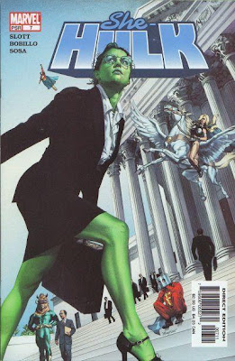 - Believe it or not, but the Marvel Comics character She-Hulk is an attorney. Above, you’ll see the cover of The Sensational She-Hulk #59, published not so long ago in 1994, during which She-Hulk, clad in her courtroom attire, asks the court for a “short recess” so that she can dispose of the host of super villains who have appeared. (One wonders how they all bypassed the security at the courthouse entrance). Whatever the case, we suspect the request was granted by the trial court judge. She-Hulk’s Wikipedia entry describes her as a “highly skilled lawyer” who has “served as legal counsel to various superheroes on numerous occasions.” She apparently practices at the fictional firm of Goodman, Lieber, Kurtzberg & Holliway which, curiously enough, has its own Wikipedia entry. (Below, at the end of this post, you’ll find the cover of She-Hulk #7, published very recently, only back in 2006. Note that She-Hulk dresses up for hearings and walks up the courthouse steps just like real lawyers do!)