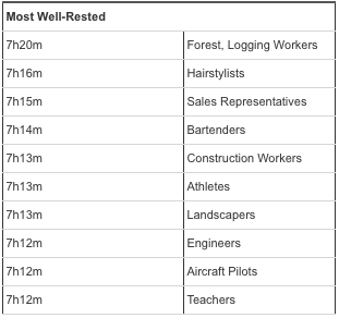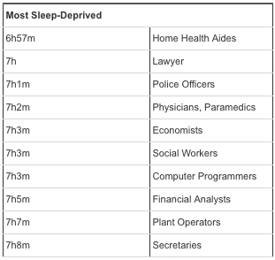 As you can see, there is not a great deal of variance among the professions on the list. To say that lawyers are more sleep-deprived than police officers because they find one less minute of sleep seems ridiculous. These sleep figures are based on the self-reported sleep times of 27,157 adults. In reality, this study may reveal that we think we have less sleep than others – not that we actually get less sleep.