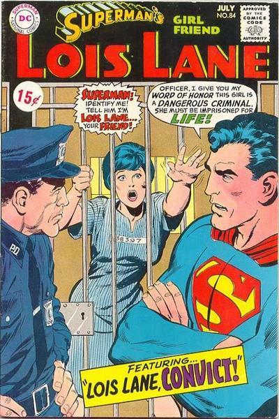 Lois Lane and Superman have a troubled relationship, it seems. Superman has cross-examined her during a lie detector test in a murder case, confronted her in jail and secured a confession of some sort, and accused her of murdering Lana Lang while Lois sat on the witness stand in a courtroom. Above, on the cover of Superman’s Girlfriend Lois Lane #84, published way, way back in 1968, we see a bit more of the same. “Superman! Identify Me! Tell him I’m Loise Lane . . . your friend,” she exclaims from her jail cell. Superman replies: “Officer, I give you my word of honor this girl is a dangerous criminal. She must be imprisoned for life!” These two have serious problems.